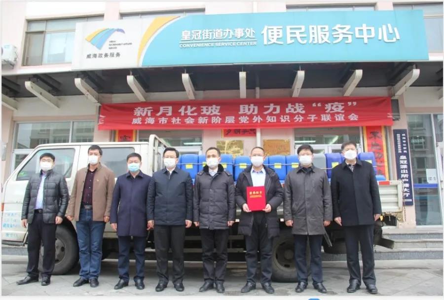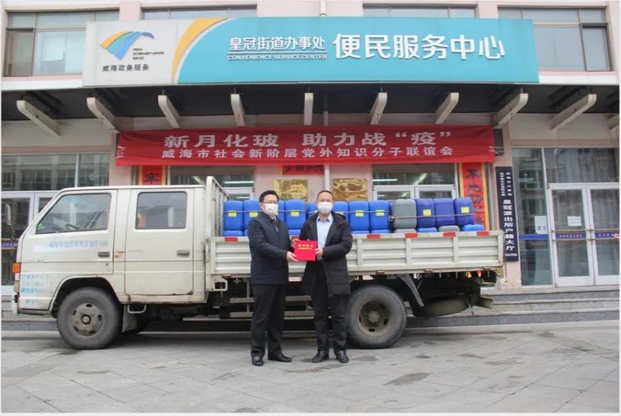 威海新月化玻儀器有限公司是一家經(jīng)營95%乙醇酒精、75%消毒酒精、過氧乙酸等化工制劑和防護(hù)口罩、測溫儀、防護(hù)鞋套等特種裝備的專業(yè)化銷售企業(yè)??偨?jīng)理李進(jìn)華,是威海市社會新階層黨外知識分子聯(lián)誼會的成員,也是皇冠街道商會的會長。新冠病毒肺炎疫情開始后,大年初二李總就帶領(lǐng)公司20多名員工放棄休假,積極聯(lián)系貨源,調(diào)配籌集物資,全力保障市場供應(yīng)。在消毒商品貨源極端緊張的情況下,公司采取限量供應(yīng),努力保障所有客戶的需求能夠兼顧,并優(yōu)先將產(chǎn)品供應(yīng)給最急需防護(hù)物資的防疫一線。