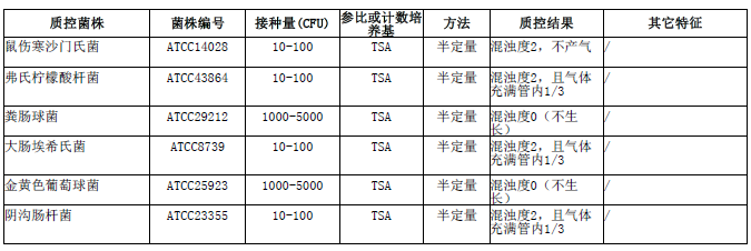 月桂基硫酸鹽胰蛋白胨肉湯(LST)微生物靈敏度試驗:按標(biāo)簽用法制備培養(yǎng)基,接種以下質(zhì)控菌株,放置36±1℃需氧培養(yǎng)24-48小時。