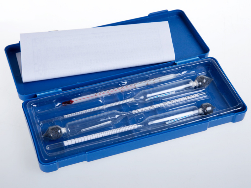 測量酒精酒度通常用酒精表、酒精計,酒精表又稱酒精比重計。酒精表是根據酒精濃度不同,比重不同,浮體沉入酒液中排開酒液的體積不同的原理而制造的。當酒精計放入酒液中時,酒的濃度越高,酒精計下沉也越多,比重也越??;反之,酒的濃度越低,酒精計下沉也越少,比重也越大。