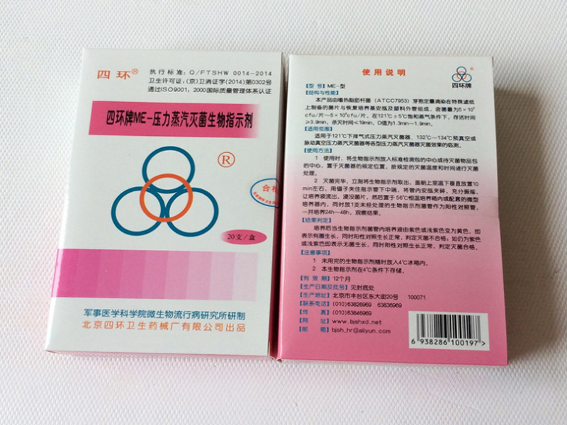 四環(huán)牌ME-型壓力蒸汽滅菌生物指示劑是由嗜熱指肪桿菌(ATCC 7953)芽孢菌片、恢復(fù)培養(yǎng)基和外管組成。