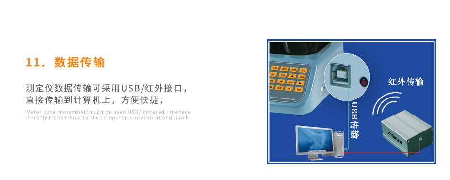 測定儀數(shù)據(jù)傳輸可采用USB/紅外接口,直接傳輸?shù)接嬎銠C(jī)上,方便快捷;